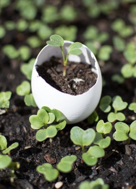 An eggshell with seedling inside, symbolise nurturing new ideas with caring and love.